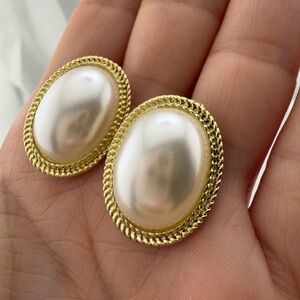 High-shine faux pearl earrings framed in gold. Gives a luxury vintage look inspired by classic designer styles. Perfect gift accessory.