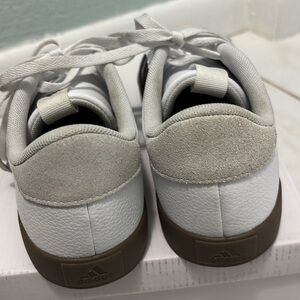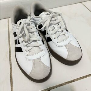 Classic adidas athletic shoes. White upper with black stripes. Comfortable and stylish.