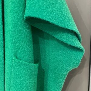 Draped Design, hooded neckline, wide shawl collar, open front style, front patched pockets wide, dropped sleeves, knit fabrication