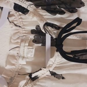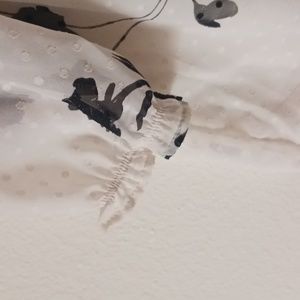 Elegant cream blouse with black floral design. Features a ruffled neckline and three-quarter sleeves. Perfect for casual or formal wear. Tag says XL, fits more like L. Not stretchy.
