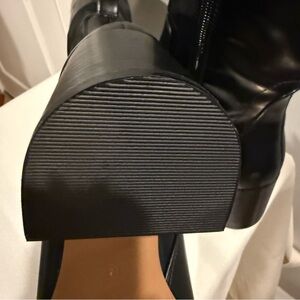 Topshop Ren knee-high heeled boots. black faux leather—feature a square or chisel toe, a block heel, and a side zip. I can never usually wear a very high heel, but found these boots extremely comfortable when just trying them.
