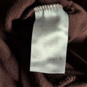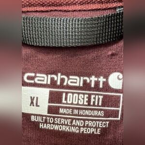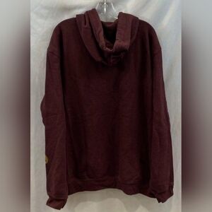 Dark burgundy hoodie with gold Carhartt logo. Comfortable and stylish for everyday wear.