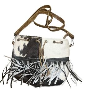 Adjustable buckled crossbody strap, 23" drop.