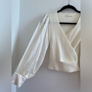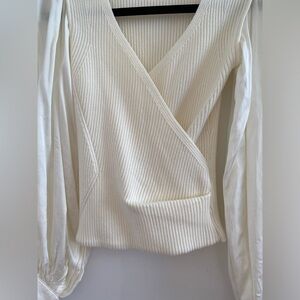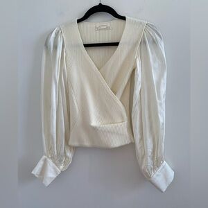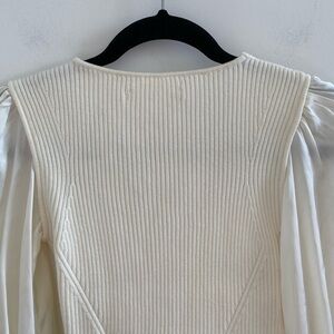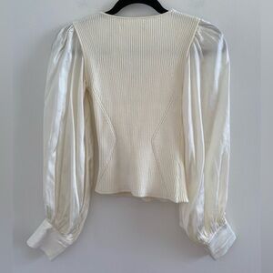 Anthropologie Ivory Twofer Faux Wrap Sweater With Satin Balloon Sleeves Size XXS