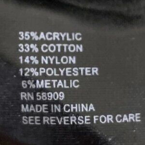 35% acrylic, 33% cotton, 14% nylon, 12% polyester,6% metallic