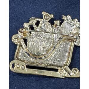 Celebrate the holidays in style with this charming gold-tone Christmas brooch featuring a teddy bear riding in a festive sleigh filled with presents and topped with tiny red and green rhinestones. Measuring approximately 1.75 × 1.5 inches, this whimsical pin is a perfect accent for your coat, sweater, scarf or holiday outfit. The original spring-style pin back has been replaced with a secure flat locking clasp to ensure wearability while preserving the piece’s vintage character. While unmarked, this style is reminiscent of late-20th c. costume jewelry holiday pieces — ideal for collectors or those seeking a unique seasonal statement piece. Pair it with your holiday wardrobe or gift it to someone who treasures nostalgic charm.