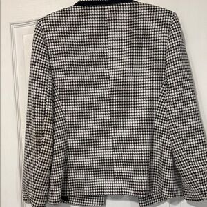 Chic checkered blazer with black trim. Features button front and structured design. Perfect for professional wear.