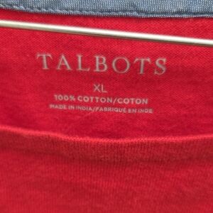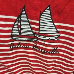 Nautical-themed long sleeve tee. Red and white stripes. Features a boat neckline and embroidery sailboat design that has the authentic Talbots logo on bottom front.