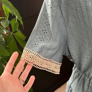 Chic blue blouse with eyelet design. Features lace trim on neckline and sleeves. Ideal for casual outings.