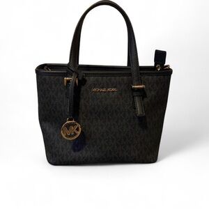 Chic Michael Kors crossbody with all-over MK logo. Elegant tan color. Perfect for daily use.