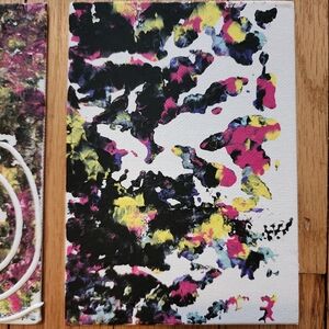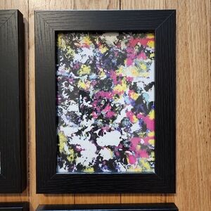 "It's Time For The Percolator" is a Unique set of 4 Black Framed Hand Painted Abstract Paintings, that are 5"x7". Using a technique that I like to call 'Smoosh Painting" with Acrylic Paint and Fabric Paint Swirls. Fun filled and colorful, these pieces of Hand Crafted Art, will Brighten Up any room in your house. Use it as Wall Decor or Table Top Decor as it has the ability to sit on your countertops and has the hanging piece for your Wall. In beautiful colors of Viva Magenta, Yellow, Light Blue, White, and Black with hints of Sparkles for a little glitz and glam. Using the Fabric White Paint to add a 3d Dimensional Effect. The paint almost creates a Tie Dye look, dopamine dressing effect, a collage of colors, and also very Avante Garde. Let this Abstract Painting grace your home.