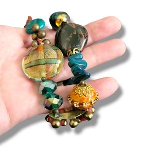 •Detail: Double strand, Antiqued gold tone metal hardware, Various sized/types of stone, glass, crystal, and metal decorative beads