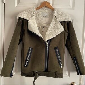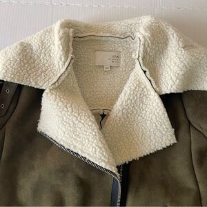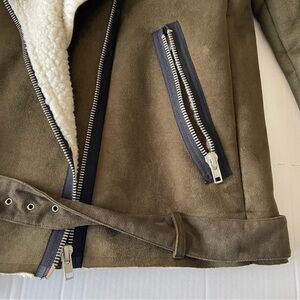 J.O.A. Olive Bomber Jacket withShearling Collar Faux Suede Sherpa Moto Cabincore