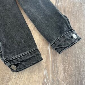 Super cute faux Sherpa lined black denim jacket. Lining is in body only (not sleeves). Pockets, button cuffs, adjustable waist. Great for layering!