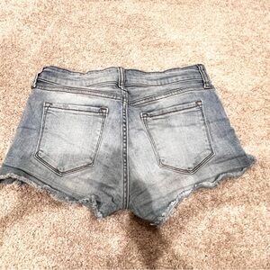 Trendy faded jean shorts. Frayed hem and classic five-pocket style. Ideal for casual wear.