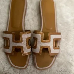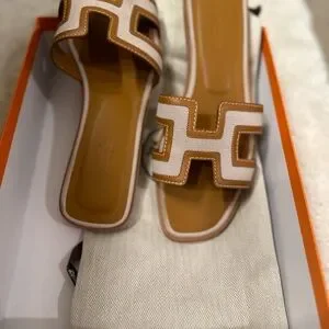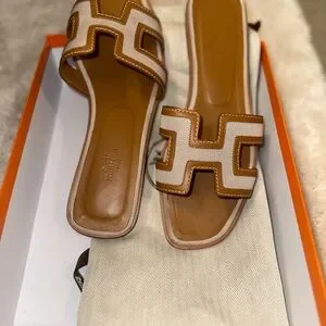 Elegant Hermes Oran slide sandals. Tan leather with white accents. Perfect for casual elegance. Combination was very hard to find it comes in. It’s box along with the tax bow the bag. I only wore this two times.