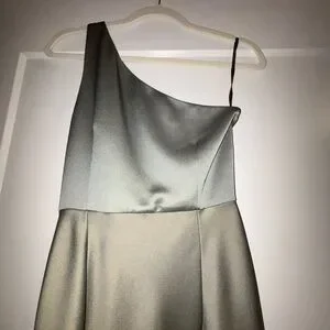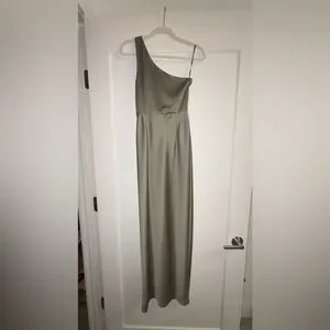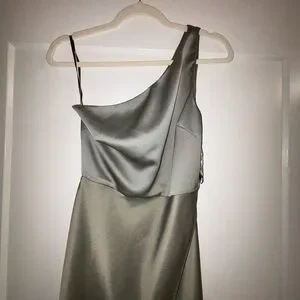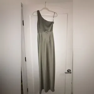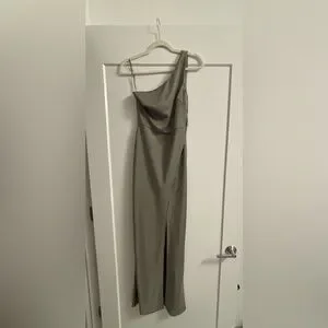 Chic one shoulder design. Sleek olive color. Perfect for elegant events. Absolutely love this dress.
