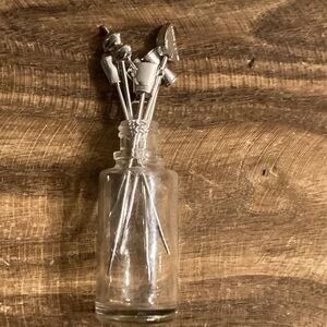 Set of six cocktail sticks. Lemon wedge, ice bucket, shaker, martini, shot, olives and clear glass holder.