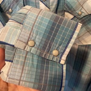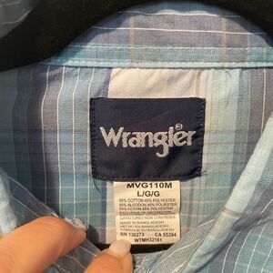 The Wrangler Authentic Western Wear Pearl Snap Blue Shirt in size L is a classic western button-up shirt made from a comfortable cotton/polyester blend fabric. It features a collared neckline, long sleeves, and a relaxed fit. The shirt also includes stylish pockets and a unique plaid pattern, showcasing a Western theme that is synonymous with the Wrangler brand. With its quality construction and timeless design, this shirt is a versatile addition to any man's wardrobe.