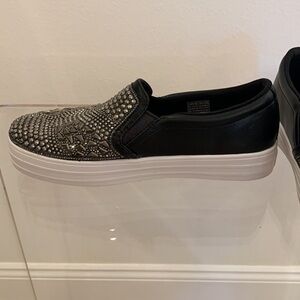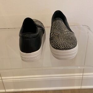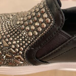 Step out in style with these chic black and silver slip-on sneakers. Perfect for casual outings, these shoes offer both comfort and flair. The sparkling silver accents add a touch of glamour to your everyday look.Lightly worn