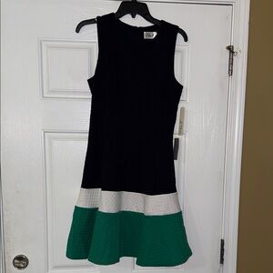 Stylish sleeveless dress featuring a navy top with white and green color block design at the hem. Perfect for any occasion.