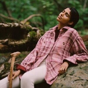 Anthropologie Hudson Plaid Shirt Jacket Shacket in Pink Maroon Sz XS NWOT