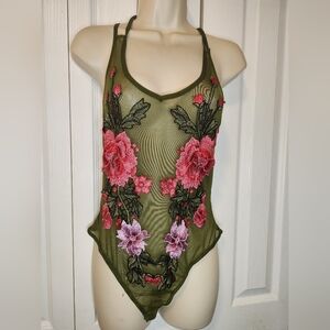Stunning sheer olive-green mesh bodysuit absolutely covered in gorgeous 3D floral embroidery – big red, pink, and purple roses with green leaves. Super sexy festival/rave/going-out piece that looks incredible layered under high-waist jeans, skirts, or worn solo!