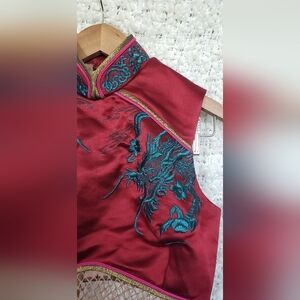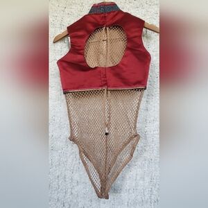 Custom made body suit with fishnet body and dragon embroidered crop top medium. has a peekaboo opening in back. hook closures, see photos.