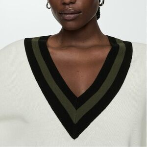 Elegant V-neck sweater by Mango. Fine-knit fabric. Straight Design. V-neck. Long sleeve. Contrast trims. Perfect for versatile styling.