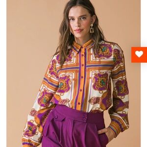 Bright floral design with a crisp white collar. Vibrant colors and stylish design. Scalloped bottom hem, beaded lace yolk, and gold metal buttons. Bust 38”. Aratta is known for its stylish contemporary clothing.
