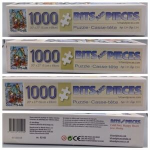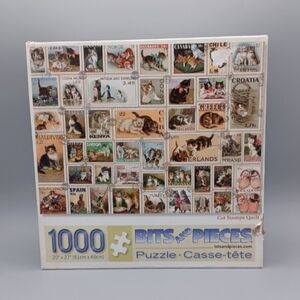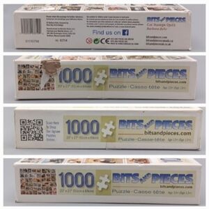 This is a set of two complete 1,000 piece Bits and Pieces puzzles called Cat Stamps Quilt and Cold Feet Happy Heart. The boxes show some signs of wear, and the pieces will come in ziploc bags. The Cat Stamps Quilt puzzle has pretty significant damage to one side of the box. For even more pictures, check out the individual listings.
