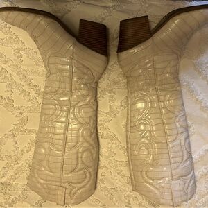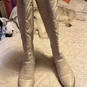 Stylish cream knee-high boots with a croc-embossed pattern. Features a side zipper and block heel.