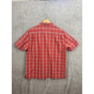 Tommy Bahama short sleeve plaid button-front shirt in a vibrant red, white & teal check pattern. Lightweight and breathable with a soft feel from the silk blend. Great casual weekend shirt, perfect for warm weather or vacation style. Size: XL Material: 70% Silk / 30% Polyester Color: Red plaid Features: Button front Chest pocket Lightweight woven fabric Classic fit Coconut-style buttons Condition: Excellent pre-owned condition. No holes, stains, or flaws noted. MEASUREMENTS Chest (pit to pit): 22.5 in Length (collar seam to hem): 29 in