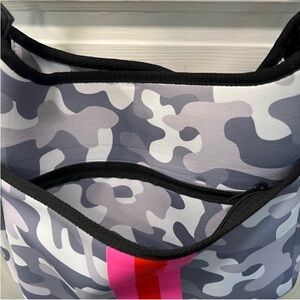White/gray camo with hot pink and red middle stripe. Adjustable/removeable pink/ orange/pink strap (Strap drop approx. 14"). Front and main zippered closures. One inside zip pocket as well as two slip pockets. Bag is in GREAT, GWC, with some minor exterior wrinkling and a few small marks on bag. Please see all pics!