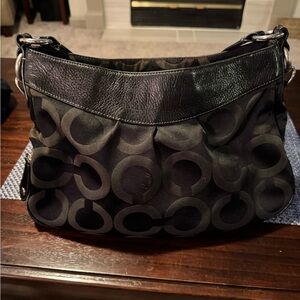 Stylish Coach shoulder bag with signature pattern. Features sleek black and gray design. Perfect for any occasion. Used condition but still a lot of wear left. There’s a little discoloring in the interior. Please see pictures