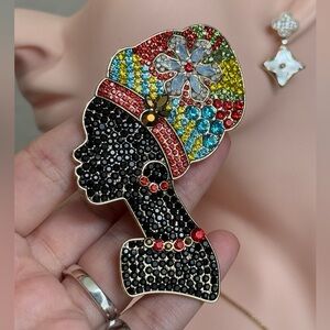 Elegant brooch with vibrant crystals. Features black, red, blue, yellow, and green accents. Perfect for any ensemble.