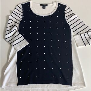 White house black market sweater crewneck top three-quarter sleeve Contrasting colors black and white Black front with raised white pearlized polkadots white sleeve with black stripes Pre-loved excellent condition approximate measurements length 26.5 across chest 16” 0496P