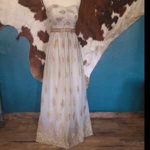 Elegant strapless dress by Blondie Nites. Features gold embellishments on a cream base. Perfect for special occasions. Built in bra. 1 stone is loose, it is pictured. Gently used.