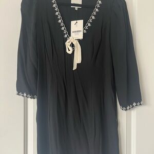Chic black dress featuring white trim and a bow detail. Perfect for any occasion. NWT