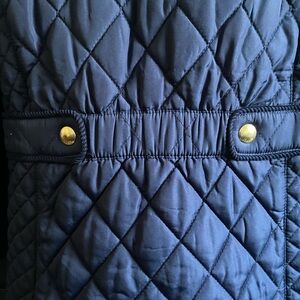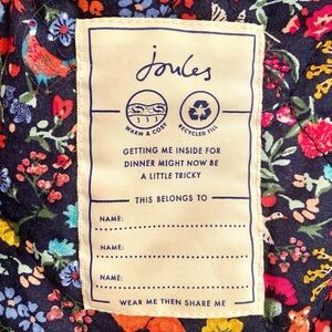Stylish girls navy quilted jacket with vibrant floral interior. This classic, stylish jacket is perfect protecting your little one against the elements and features cord detailing and deep pockets, and elasication in the back. It fastens with a zipper and buttons. Joules branding, lined, and machine washable. Size 8 / 128 cm. Good condition and stored in a nonsmoking home.