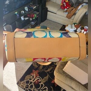 Vibrant satchel with signature Coach pattern. Features multicolor design. Stylish and functional.