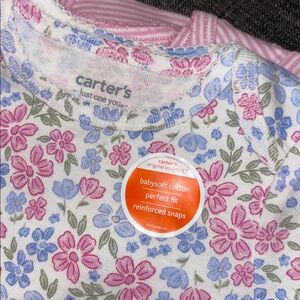Charming Carter's bodysuits with floral and striped patterns. Soft pink, blue, and white hues. Ideal for daily comfort.