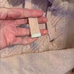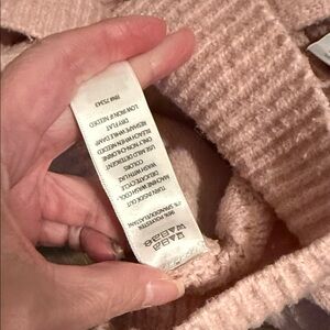 Soft blush sweater with cowl neck. Features cable knit design. Ideal for cozy days.