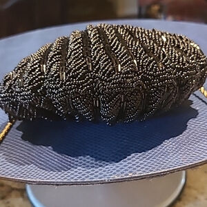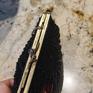 Vintage 60’s shell style purse is covered in shiny black round and bugle glass beads. It has a gold tone kiss lock closure and a long gold shoulder chain. The interior is black satin with one pocket. Purse measures 6” by 6”. Clean condition inside and out. Stand out with this lovely beaded bag.