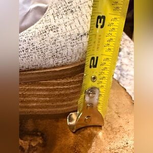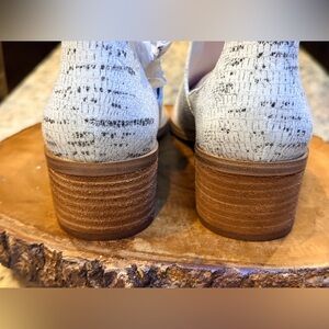 Features a wooden heel.