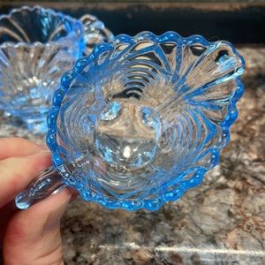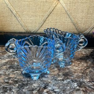 A vintage, light blue glass cream and sugar, Cambridge glass (?), 2.75”H.