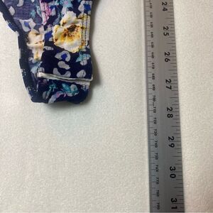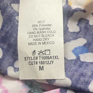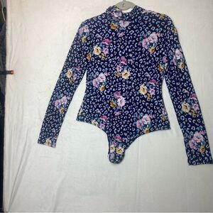 White Birch Blue/Floral Design Body Suit Size Medium. Excellent pre-owned condition. Turtleneck body suit with long sleeves. Lightweight. Polyester/spandex blend. Hand wash. Style T1009A1XL. Measures approximately chest 34", length 27", sleeve 24.5".