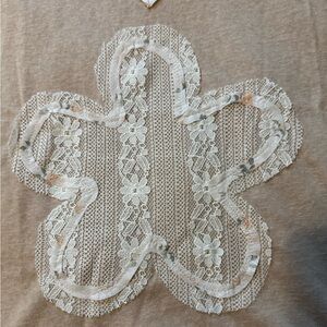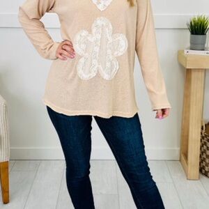 comfort. Featuring delicate floral lace and patchwork details along the neckline and a statement appliqué on the front, this top displays a touch of nostalgia with a modern twist.