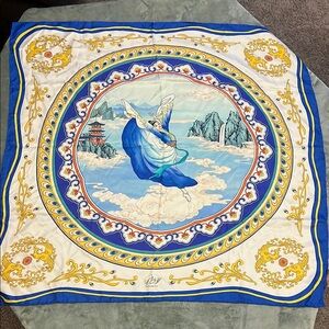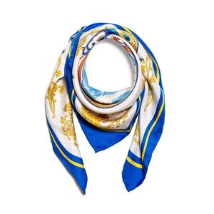Add a touch of elegance to your outfit with this stunning blue and gold scarf. Perfect for any occasion.