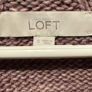 This item is an Anne Taylor Loft alpaca wool blend sweater with a shawl collar in a brownish-purple or mauve color. This style features a deep, open neckline and a chunky knit texture, made with an acrylic, alpaca, and wool blend for softness and warmth. Pullover Style.